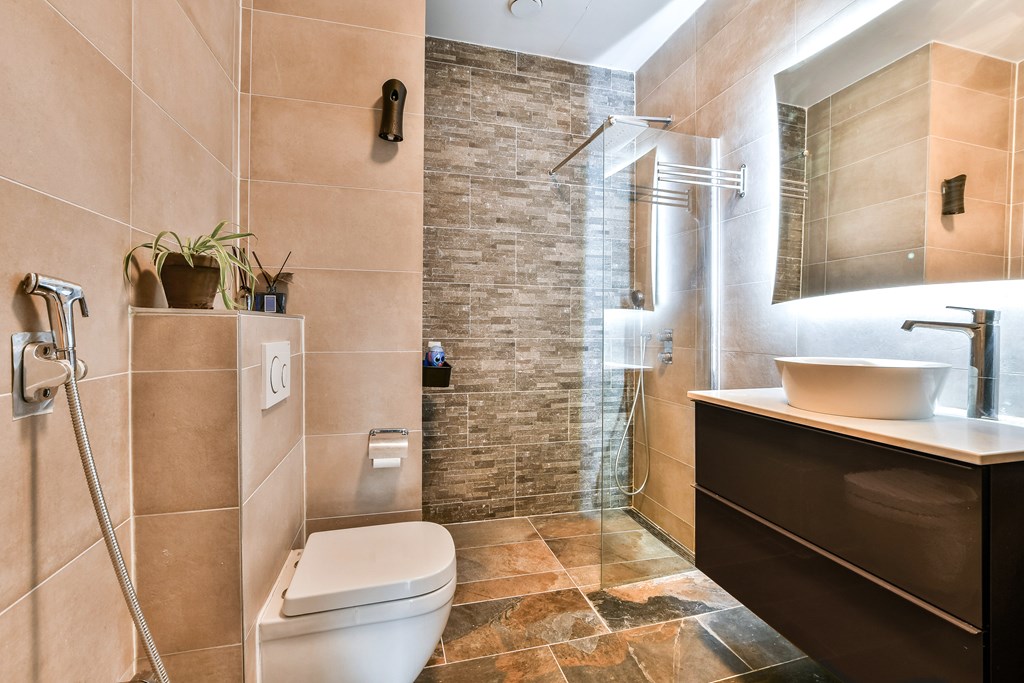 is stylishly finished and equipped with a walk-in shower, vanity unit, and toilet with bidet function.