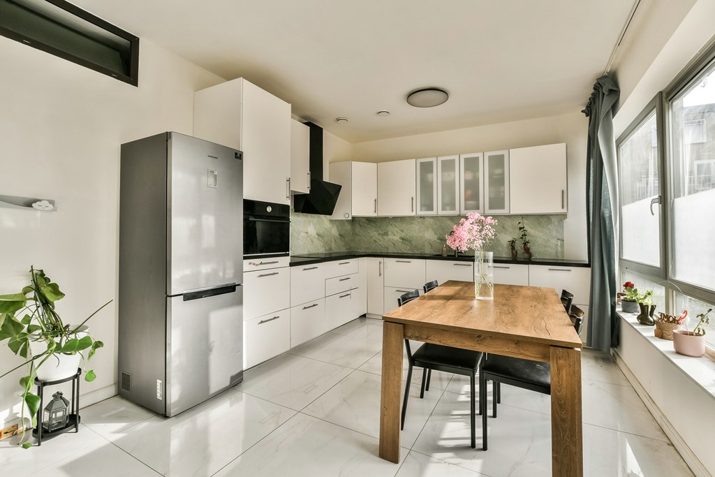 Binnen treft u een lichte woonkamer met open keuken in praktische hoekopstelling, voorzien van diverse inbouwapparatuur. Dankzij de grote raampartijen en directe toegang tot de tuin ervaart u een fijne verbinding tussen binnen en buiten.