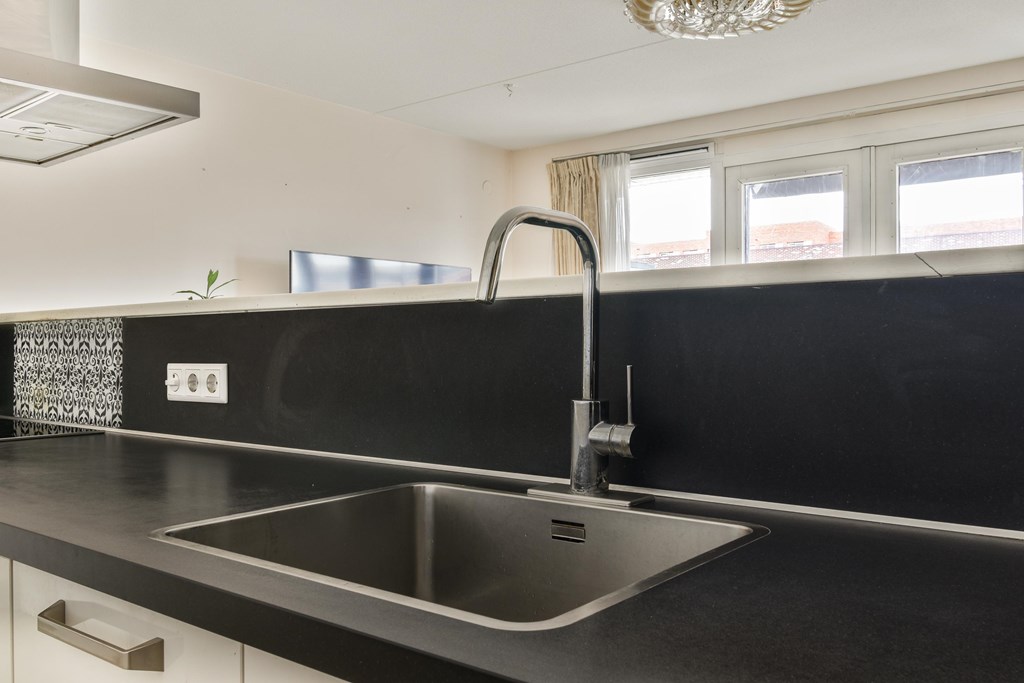 Aan de voorzijde van het complex bevindt zich de lichte woonkamer met open keuken. Dankzij de grote ramen en openslaande deuren naar het zonnige balkon op het zuidwesten voelt deze ruimte ruim en uitnodigend aan – een heerlijke plek om tot rust te komen.
